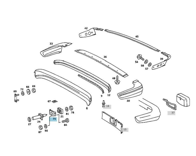 Genuine Mercedes front or rear bumper shock bracket. Product for rear shock shown in schematic as number 75. Product for front bumper shock shown in schematic as number 84. This is the bracket only, no other parts are included. This fits all 123 chassis vehicles between 1977 and 1985.